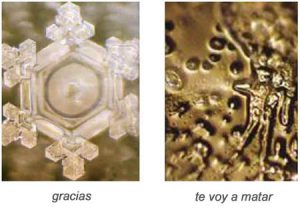 Lo hicieron con muchas palabras más: Amor, dolor, ángel, me das asco,demonio, estúpido, alma… y en todas las muestras expuestas a palabras negativas los cristales eran deformes y oscuros. Las palabras bonitas, en cambio, creaban formas preciosas, llenas de luz y belleza.